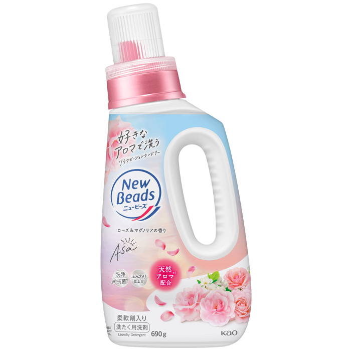 КАО New Beads Концентрированный универсальный гель для стирки белья, аромат магнолии, 690 г. Обладает роскошным стойким ароматом: изысканная цветочная композиция с нотами розы и магнолии сохраняется на одежде даже во время носки.
