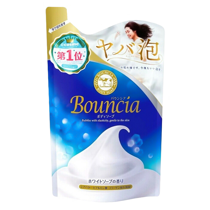 COW BRAND "Bouncia" Жидкое увлажняющее мыло для тела "Взбитые сливки" с гиалуроновой кислотой и коллагеном, аромат свежести, запасной блок 400 мл.